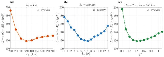 Estimation of the (a) horizontal correlation length, , (b) vertical correlation length, , and (c) observation error covariance parameter, , using independent TCCON observations with the cross-validation cost function, .