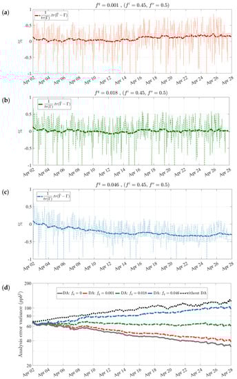 Furthermore, we verify the influence of the model error on the analysis error variance in Figure 5d. Both cases of “without DA” and perfect model or ( = 0) produce too small or too large analysis error variance as time proceeds, causing degraded assimilation results with overestimation or underestimation implications. Therefore, the presence of a certain amount of model error is crucial. As found in the diagnostic above, we infer that the proposed model error parameter ( = 0.018) also maintains a stable analysis error variance over time.