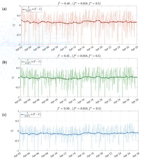 Writing the diagnostic in this fashion removes the dependency of the diagnostic to the absolute statistics, so that it retains a similar form to other diagnostics such as χ2 [45]. Therefore, a proper model error in our estimation system is obtained when it satisfies the near-zero normalized variance matching with continuous stability over time. Figure 5 illustrates the influence of the model error on this diagnostic. A small (Figure 5a) leads to an increasing pattern () over time, whereas a large (Figure 5c) results in a decrease (); both of them tend to disagree with the innovation variance consistency over time. A proper value of = 0.018 (Figure 5b) can be found with trial and error that fulfills the innovation variance consistency. Note that the initial error variance parameter is kept constant = 0.45 for all cases, while it is shown for its best estimate (see Figure 6).