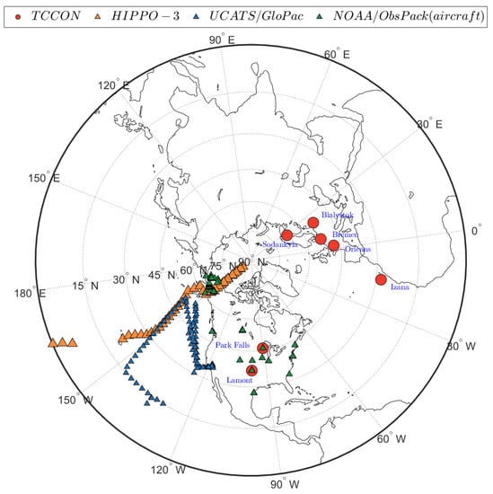 TCCON is a ground-based FTS network that provides a time series of CH4 column-averaged abundance worldwide. TCCON data has been used to compare with model simulations and satellite data primarily for validation purposes [15,47,48,49,50,51,52]. We used the GGG2014 version of TCCON XCH4 data from seven sites (red circles in Figure 7), including Park falls [53], Orleans [54], Lamont [55], Bremen [56], Sodankyla [57], Izana [58], and Bialystok [59], available at https://tccondata.org/2014 (accessed on 14 November 2021). TCCON is calibrated using aircraft profiles to maintain better than 0.5% accuracy of XCH4 retrievals [60]. Prior to the comparison with the model or analysis, we convolve CMAQ with TCCON average kernels and the corresponding a priori profiles, for which the procedure is described in Wunch et al. (2010) [61] or through the website https://tccon-wiki.caltech.edu/Main/AuxilaryData (accessed on 14 November 2021). Similar to the aircraft measurements described later in this section, TCCON retrievals are assumed to provide an independent evaluation for our assimilation results. This is due to the fact that TCCON is neither used in generating the model input nor in calibrating the GOSAT data with CMAQ. We recall that GOSAT data are bias-corrected against only surface measurements of GLOBALVIEWplus CH4 ObsPack v3.0 as described in Sections 4.1 and 4.2 of Part I [1]. Therefore, any influence of TCCON calibration on GOSAT data prior to this study will be entirely alleviated. Note that we employed the same latitudinal correction on TCCON as we used for GOSAT to ensure a consistent comparison with independent observations.