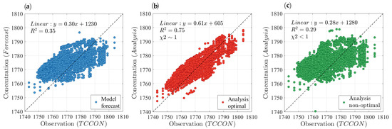 Before evaluating the performance of the optimal analysis against independent observations, we highlight the differences between an optimal and nonoptimal analysis. Accordingly, under similar conditions (e.g., model configuration, inputs), the optimal analysis is compared against another analysis produced with an arbitrary, yet commonly used, nonoptimal set of parameters. The globally optimized parameters in April 2010, as described in Section 3 and Section 4, consist of = 0.5, = 0.45, = 0.018, = 350 km, = , whereas the arbitrary parameters include = 1.2, = 0.45, = 0, = 600 km, = , for the nonoptimal case. Figure 8 demonstrates the comparison of model forecast without data assimilation (blue circles), analysis with optimal parameters (red circles), and analysis with nonoptimal parameters (green circles) against independent TCCON observations. The results indicate that both and the regression slope are the smallest for the nonoptimal analysis while the mean bias is the largest. It suggests that the nonoptimal analysis generated with a set of arbitrary, but typically used, parameters could result in an agreement even worse than the model against independent measurements. This behaviour was also found for the analysis of PM2.5 with surface observations [30]. On the contrary, the optimal covariance parameters produce an analysis that maintains a significantly higher consistency with TCCON observations than the model without assimilation. Similar results are obtained with other types of independent observations and a different set of arbitrary (nonoptimal) parameters (see Figures S1–S6 in the Supplementary Materials). Thus, it could be inferred that proper estimation of error covariance parameters is essential for PvKF assimilation and most data assimilation schemes that also depend on those input error covariance parameters (e.g., 4D-Var, EnKF).