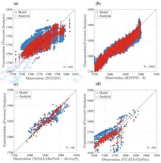 Comparison between the model forecast (blue circles) and analysis with GOSAT assimilation (red circles) sampled at four types of independent measurements, including (a) TCCON, (b) HIPPO-3, (c) NOAA/ObsPack aircraft, and (d) UCATS/GloPac. N denotes the number of observations of each type.
