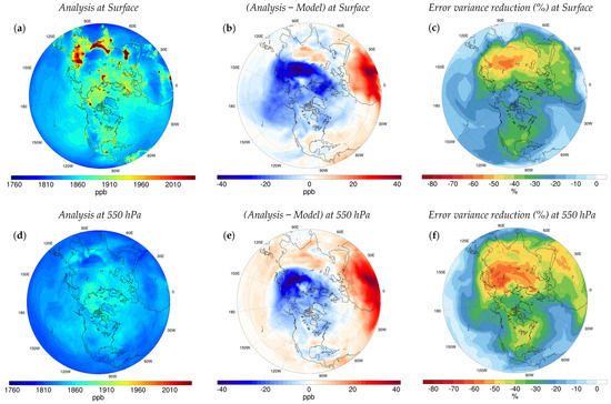 The monthly average of the analysis, analysis increments (i.e., Analysis − Model), and the analysis error variance reduction at the surface and 550 hPa are shown in Figure 11. We found that the largest downward correction occurs over Russia, while the largest upward correction is over tropical Africa (Figure 11b). These results are consistent overall with recent methane inverse studies; for example, Wang et al. (2019) [8] considered a 200% downwards adjustment to the prior emissions over Russia from EDGAR. Zhang et al. (2021) [52] estimated Russia’s anthropogenic emissions to be about 59% of its prior value, mainly attributed to the oil-and-gas sector. In the same study, a large upward correction in the prior inventory is also reported over East and tropical Africa, mainly due to the growth of livestock and wetland emissions. Our analysis at the surface also suggests a positive bias over India, Japan, eastern China, Europe, high latitudes, western U.S. and all over Canada, whereas a comparatively negative bias over the South and Southeastern U.S., northern regions of South America, and Central Asia. Note that several factors such as the discrepancy between emission inventories, the atmospheric model, and the temporal variations can explain slight differences between studies. In addition, the correction near the Equator in our hemispheric assimilation could be too diffusive to constrain the spatial pattern of the bias on regions next to the Equator; hence, all plots in Figure 10 and Figure 11 are shown above 5°N.
