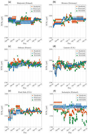 Comparison of the time series of the analysis (red dots) and the model (blue dots) against TCCON observations (green dots). Six TCCON observation sites (Figure 7—red circles) include (a) Bialystok (53.23°N, 23.03°E), (b) Bremen (53.10°N, 8.85°E), (c) Orleans (47.97°N, 2.11°E), (d) Lamont (36.60°N, 97.48°W), (e) Park Falls (45.95°N, 90.27°W), (f) Sodankylä (67.37°N, 26.63°E).