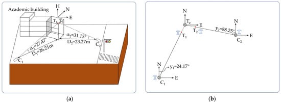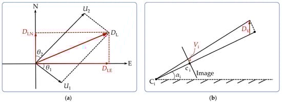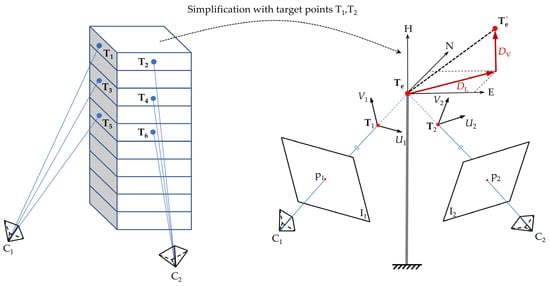 As shown in Figure 1, the different target floors of the high-rise building are observed by the cameras C1 and C2 from its left and front sides, respectively, obviously forming two non-overlapping views. The lines of sight of the cameras strike different sides of the target floors, generating a set of target points, e.g., T1 to T6. For any pair of target points, such as Ti (i = 1, 2) on the top floor, the corresponding cameras can sense the displacement components, denoted by Vi and Ui, parallel to their image planes. If we follow the assumption above and represent the target level by the 3D point , its lateral displacement, DL, and vertical settlement, DV, can be obtained from the displacement components of T1 and T2 by following the adding principle. To achieve the goal, the azimuth coordinate system E-N-H, rather than the Cartesian coordinate frame, in Figure 2a, is introduced to build a common coordinate frame for both cameras. With this simplification, the fundamental model of sensing lateral displacement and vertical settlement can be established as follows.