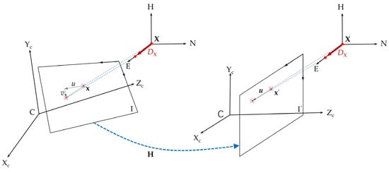Figure 1 shows that both cameras observed the target points in a lateral oblique position, implying the measured settlement is affected by the lateral displacement. In particular, the lateral displacement of high-rise structures under external excitation is often much larger than the vertical displacement. As a result, the vertical displacement Dv, estimated by Equation (3), often contains a large error. The underlying reason is that the perspective projection does not hold parallelism. Therefore, when the image planes are not parallel to the plane DL–DV, lateral displacement of the object will cause the change of the vertical displacement. To address the problem, a homography-based correction approach is introduced here to correct the vertical displacement by mapping the inclined image plane (relative to the span plane of DL and DV, denoted by DL–DV) into the one parallel to the plane DL–DV, as shown in Figure 3. The inclined image plane I is the actual one on which the measured lateral and vertical displacements are coupled. Our goal is to map I to the image plane I’ by following the homography transformation, denoted by a matrix H, between them. Let x and x’ be the actual and corrected projections of the 3D target point X on the images I and I’, respectively. The relationship between x and x’ can be expressed as follows [38]: