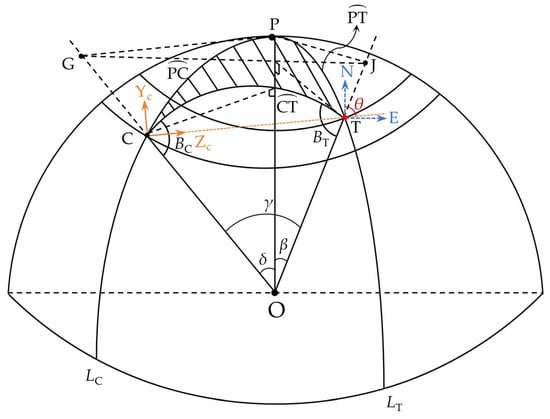 As shown in Figure 4, one camera C is set to observe a target point T. The relative positional relationship, namely the yaw angle θ, of them can be described with two points on a spherical triangle [39]. For that, two receivers of the GNSS are placed at the positions of camera C and the target point T to obtain their longitude and latitude coordinates, denoted by (BC, LC) and (BT, LT), respectively. Suppose O is the center of the earth sphere and P is the apex of the northern hemisphere. (The north direction is the starting target, and the clockwise direction is positive.) Points P, C, and T form a spherical triangle PCT, which gives the relative spatial relation for determining the yaw angle. One can see that the tangent of the arc edges and , passing through the point P, intersects with the lines OC and OT at the points G and J, respectively. Let δ, β and γ be the spherical center angles corresponding to the arc edges , and , respectively. We can obtain the following relationship according to the cosine formula of the spherical triangle: