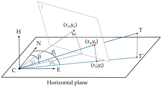 It is worth noting that, because of the height difference between the camera and the target point in real applications of measuring the high-rising buildings, Equation (14) actually gives the yaw angle of the projection, denoted by CT’, of the line of sight CT on the E-N plane relative to the north direction, as shown in Figure 6. This will lead to a measurement error if the observed image point (xt, yt) is directly used to compute the displacement together with the determined yaw angle in Equation (14). A reasonable approach is to use the point (xt’, yt’) on the line CT’ that corresponds to the observed projection on the line CT. This can be done by inversely rotating the point (xt, yt) using the pitch angle αt, where αt is computed according to the measured pitch angle α and the distance from the observed projection to the image center by following the method in [31]. As the pitch angle representing the height difference between the camera and the target point, the foregoing rotation operation implicitly eliminates the error caused by ignoring the height difference in determining the yaw angle. In this paper, this rotation process is implemented by applying Equation (6) because the homography matrix H is related to the rotation matrix in Equation (9), which considers the pitch angle.