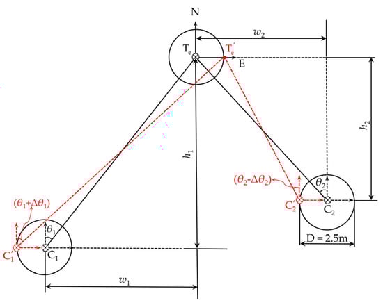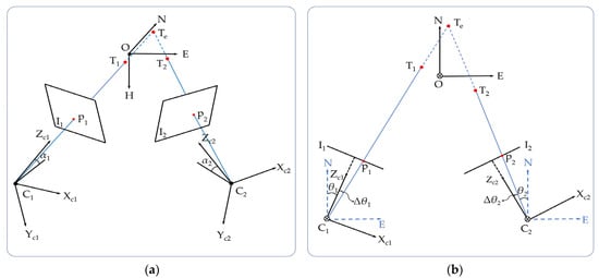 In Figure 14, C1, C2 and Te represent the real positions of the two cameras and the equivalent target point in the E-N-H system, respectively. , and are the positions of the two cameras and the equivalent target point at the maximum yaw angle error corresponding to the SPP method, respectively. Let w1 and w2 be the horizontal distances of the real equivalent target point from the real positions of C1 and C2 along the direction E, and h1 and h2 be the corresponding horizontal distances of the equivalent target point along the N direction. Then, relative to the equivalent target point, the maximum yaw angle error Δθ1 of the camera C1 and that Δθ2 of the camera C2 are given as: