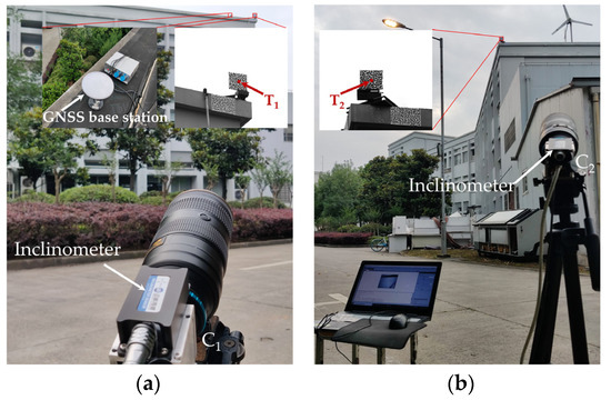 To show the potential capability of the proposed method in actual applications, an outdoor experiment was carried out. In the experiment, two square panels with speckles were fixed on a translation stage (accuracy is 0.01 mm) which was fixed on the roof of a building, as shown in Figure 10. The two panels are placed close and perpendicular to each other. Two cameras C1 and C2 (Baumer TX50, 200 mm Nikon lens with a model of af-s70-200/2.8e) were placed at the different sides of the building to observe the target points T1 and T2 on the speckled panels, respectively. The distance between the two target points was about 150 mm. For each camera, a dual-axis inclinometer (MSENSOR Tech, Wuxi, China) was amounted on its upper face. The measurement range and accuracy of both inclinometers were ±90° and 0.01°, respectively. To obtain the pitch angle of each camera, the leading axis of the inclinometer was parallel to the optical axis of the camera. The GNSS was a self-developed differential positioning system based on the chip F9P (made by Beitian communication). The horizontal positioning accuracy and elevation positioning accuracy of the positioning system were 1.00 cm and 2.00 cm, respectively. Before testing, the positions of both cameras and the targets in the E-N-H system were measured by using the GNSS. The overall experiment site and the relative positions between the targets and the cameras are shown in Figure 10 and Figure 11, and the positions and distances between the cameras and the corresponding target points are listed in Table 2.