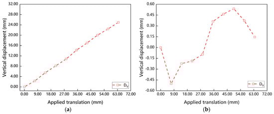 To verify the capacity of the proposed method for tackling the settlement, the vertical displacement values in this test were computed by Equation (3), and then corrected according to the homography-based strategy in Section 2.1. Figure 13a,b show the computed vertical displacements before and after correction, respectively. From (a), one can see that the error of the vertical displacement increases linearly when the applied lateral displacement increases, and the maximum value can be up to 26.00 mm, implying that the settlement determined by Equation (3) is linearly affected by the lateral displacement. In contrast, the corrected vertical displacements in (b) are much more reasonable than those in (a), and the maximum value is just 0.53 mm. The results in Figure 13 demonstrate the feasibility of the strategy for settlement computation in Section 2.1.