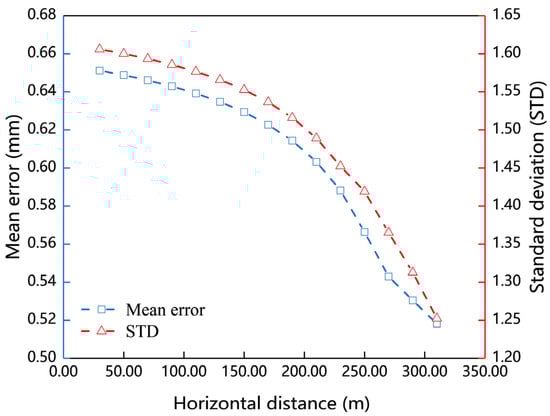 Assuming that the GNSS used in the field experiment in Section 3.2 is characterized by the SSP mode, the yaw angle errors Δθ1 and Δθ2 can be deduced as 4.79° and 0.21°, respectively, by Equation (15). According to Equation (2), by increasing the distances between the cameras and the target point, the mean value and standard deviation of the absolute errors of the measured lateral displacements can be evaluated, as shown in Figure 15.