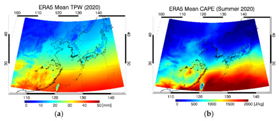 The study area is a part of the Northeast Asia region (22–47°N and 110–145°E, see Figure 1) which corresponds to ELA centered on the Korean Peninsula as one of the GK2A observation regions. The selected region includes the Western Pacific Ocean as well as the Korean Peninsula, Japan, China, and Southeast Russia. Overall, the distributions of averaged values within the ELA region during the year 2020 for TPW and summer 2020 for CAPE display characteristic high values around the Equator and low values toward mid and high latitudes, as shown in Figure 1a,b. This pattern is particularly shown over the ocean, whereas the impact of altitude (Figure 1c) is found in the land [28]. In the summertime, a great deal of severe convective systems occur in Southeast Asia since the warm and damp air current from the tropical oceans provides sufficient water and seasonal precipitation [10].