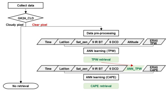 To construct the dataset of the ANN model for the retrieval of TPW and CAPE, GK2A/AMI and ERA5 data were collected in the ELA region. Table 2 describes the input variables of the learning dataset and its physical characteristics. In this study, time and geographic information, satellite zenith angle, and nine IR brightness temperatures (BT) of GK2A/AMI are used as the input variables. The BT at each channel measures different characteristics in the atmosphere. For instance, the atmospheric window channels (BT 11, 13, 14, and 15) indicate the surface properties related to the temperature of land and sea, whereas the water vapor channels (BT8, 9, and 10) show the water vapor in each different mid-level atmosphere. O3 and CO2 channels are cooler in the clear sky than the window channels due to the absorption of O3 and CO2, respectively [53,54]. In addition, the six dual channel differences (DCD) which represent the amount of water vapor at each level are used. The elevation from DEM data is used only for the retrieval of TPW, and the TPW calculated from ERA5 is used for the retrieval of CAPE.