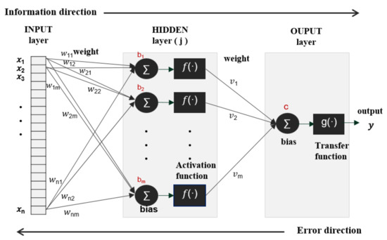 where is the estimated prediction of the output layer, is the input vector, is the weight between the input node and the hidden node, is the weight between the hidden node and the output node, is the bias in the hidden layer, is the bias in the output layer, and and are the activation function in the hidden layer and the output layer, respectively.