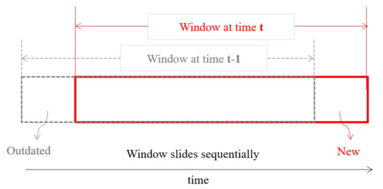 In INC learning, a window-based approach that produces compact and representative data, is used [48,49] to handle a huge amount of data constantly coming. This approach incrementally adjusts the previous model using the most recent window. The window represents each block of data which divides the historical data into a period [50]. A sliding window with equal width is utilized in the study to achieve time and space efficiency, although its histogram produces a high variance. Unfortunately, this method may cause any catastrophic forgetting to completely forget any previously learned knowledge [47] when the target concept abruptly changes while the previous window moves to the next window. Therefore, to gradually forget the outdated data and to update the newly arrived data, a sliding temporal window with time steps where the drift does not occur and the error is stable is utilized. The “step size” of the sliding window is the size of the “sliding” action, which is the length of sequence move between each window. Figure 5 shows an example of the process of updating from t − 1 to t.