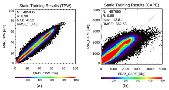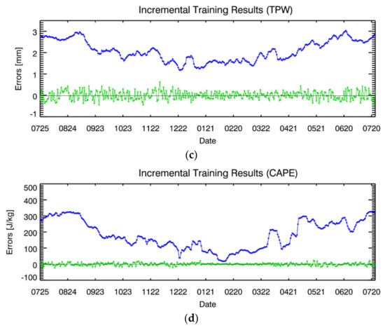 Figure 8 depicts the training performance of the ST and INC learning models for TPW and CAPE during the periods from 25 July 2019 to 24 July 2020 for the ST learning and from 25 July 2020 to 24 July 2021 for INC learning. The bias, RMSE, and R of the ST ANN are –0.12 mm, 3.43 mm, and 0.98 for TPW and −12.81 J/kg, 362.63 J/kg, and 0.88 for CAPE, respectively (Figure 8a,b). The training results of the INC ANN model are shown as time series graphs since the INC learning is continuously trained over time in Figure 8c,d. INC algorithm has the biases fluctuating with a small width based on the zero value for both variables and RMSE ranging from 1 mm to 3 mm and 0 J/kg to 300 J/kg in TPW and CAPE, respectively. According to the training results, it is clear that the INC algorithm for TPW and CAPE outperforms the ST ANN model in terms of model performance.