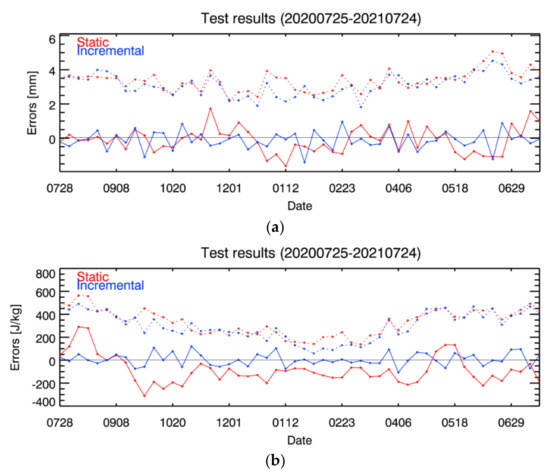 Model stability of (a) TPW and (b) CAPE depending on the learning method (ST and INC method) during the test period. The red is ST learning and the blue is INC learning. The solid and dotted lines are the bias and RMSE, respectively.