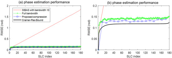 To compare different scenarios, we consider the phase linking performance for three estimators. A Small temporal Baseline Subset (StBAS) with bandwidth 10 is equivalent to using up to lag-10 measurements at each processing level. Full bandwidth is the case that exploits all-time series data. The mini-stack is set as 10 for the proposed compression. Finally, the Cramer–Rao Lower Bound (CRLB) is the theoretical performance that uses simulated coherence for the calculation as in [26].