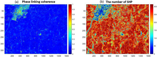 Internal results from PSDS-based processing. (a) the phase linking coherence corresponding to the SHP map; (b) the number of SHP identified using a 9 × 35 window.