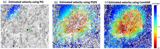 Figure 5 shows the average velocity maps at PS pixels solely (Figure 5a) and PSDS points using either the PSDS InSAR (Figure 5b), or the ComSAR (Figure 5c) techniques. The distribution of the estimated velocities is shown in Figure 6. These results are relative to the average of reference data (see Figure 7a). We can observe a significant performance gain using PSDS-based approaches over the classical PSI method. Compared to the PSI algorithm based solely on PS, the increased density of PSDS pixels provides increased confidence in estimations from the advanced PSDS and ComSAR algorithms (see Table 1). It is evident that the ComSAR is of superior quality to the PSI and PSDS techniques. This is mainly because the noise component of the data space is suppressed in the data compression. In other words, in artificially compressed interferograms from the mini-stacks, the noisy short-lived components are canceled out. Therefore, these interferograms are in general higher SNR with respect to initial ones.