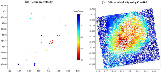 The reference velocity and estimated velocity are shown in Figure 7 with longitude in horizontal and latitude in a vertical direction to appreciate the ComSAR result. A circle-shaped subsidence zone is visible in Figure 7b with a 5 km diameter and subsidence up to 20 mm/year, consistent with the previous reports ([38,39]). Interestingly, to our knowledge, this is the first time we can see a very density spatial coverage in the Vauvert area from the InSAR analysis. This allows us to identify some deformation features that are difficult to detect with PS pixels.