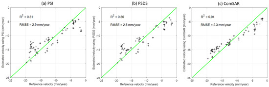 The cross-plot 1:1 velocity comparison. (a) estimated velocity using PSI; (b) estimated velocity using PSDS; (c) estimated velocity using ComSAR.