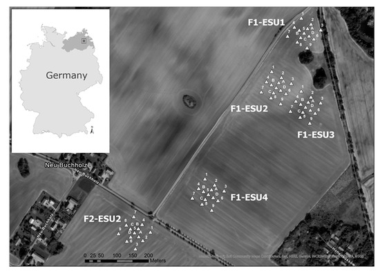 As shown in Figure 1 Elementary Sampling Units (ESU) were aligned as squares with an edge length of 72 m according to geometric resolution of RS data [52,53,54]. Each ESU consists of 13 Secondary Sampling Units (SSUs) to assess spatial heterogeneity within an ESU. Nine of these are arranged in three rows of three sampling locations each and numbered from one to nine. Additionally, there is a quadrant of sampling locations around the center (SSU 5) labeled A through D [52].