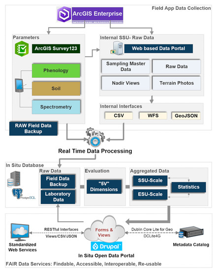 Thus, there is a strong need for the connection of agricultural research networks and databases to facilitate information access and flow between different research disciplines in the context of FAIR open data for sustainable and precision agriculture [37]. In this study we present a digital data management workflow of in situ data from the field to the database for the standardized data collection, processing and dissemination of agroecological ground data. Our developed framework of InsituDB is focused on widely used field data collection methods of three different parameter groups, biophysical, pedological and spectral, beneficial for agricultural applications of RS. The field methods are oriented on JECAM and Copernicus initiatives. The workflow innovatively uses state-of-the-art geospatial technologies and data management, including near real-time quality control. The goal was the conception and implementation of a transferable process chain from data acquisition to service-based presentation and subsequent utilization by a wide range of users. The focus is not only on the data sets themselves, but also on the broad use of the developed process chains, in the sense of a transferable best-practice use-case.