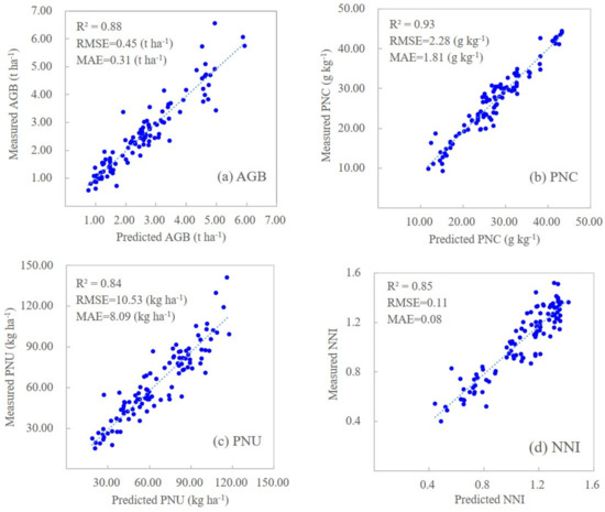 Across site-years, AGB had the highest variability, followed by PNU, PNC, and NNI in the calibration dataset (Table 5). The prediction dataset had similar variability (Table 5).