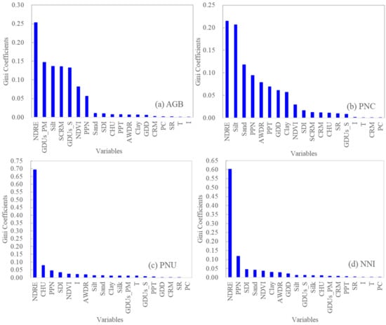 Relative importance represented by Gini coefficients of different input variables used in the random forest regression models using sensor-provided vegetation indices (NDVI and NDRE) and genetic, environmental, and management variables for predicting aboveground biomass (AGB) (a), plant N concentration (PNC) (b), plant N uptake (PNU) (c), and N nutrition index (NNI) (d). Note: NDRE: normalized difference red edge. NDVI: normalized difference vegetation index. CRM: comparative relative maturity. SCRM: silk comparative relative maturity. GDUs_S: growing degree units to silk. GDUs_PM: growing degree units to physiological maturity. PPT: total precipitation from planting to sensing. SDI: Shannon diversity index. AWDR: abundant and well-distributed rainfall. CHU: corn heat units. GDD: growing degree days. PPN: preplant N rate. I: irrigation. T: tillage. SR: seeding rate. PC: previous crop.
