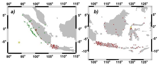 GNSS stations from SUGAR array (green triangle) and INACORS (red triangle) used in (a) the 2016 West Sumatra earthquake, and (b) the 2018 Palu earthquake. The epicenters are marked with the yellow stars. Both were strike-slip earthquakes.