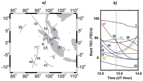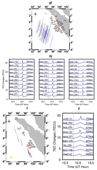 The research focused on four satellites (GPS PRN 9,17, and 23 and GLONASS PRN 4) for the 2016 West Sumatra and 2018 Palu earthquakes (GPS PRN 21 and 25) because the CID is consistent in appearance. The condition of one-direction geometry between the epicenter and GPS receivers can be found in the GPS PRN 9 (Figure 2e), 17 (Figure 2g), and 23 (Figure 2i). This condition is important because it enables shallow LOS penetration with the CID wave front. In order to obtain a clear anomaly, the receiver should be located on the same side of the epicenter as the SIP and farther from the epicenter than the SIP [21].