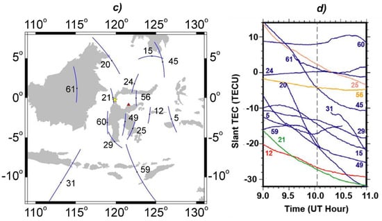 In the case of the 2018 Palu earthquake, the data were obtained from the INACORS station in Sulawesi, Kalimantan, and Java Islands. CIDs appeared after the mainshock and were detected by GPS PRN 21 and 25 with maximum amplitudes of 0.4 TECU, as shown in Figure 2d.