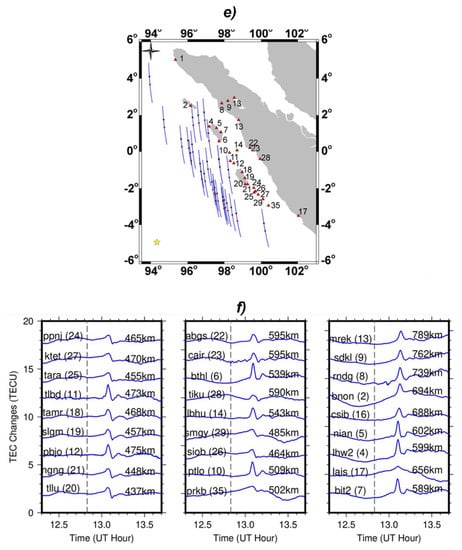 A large earthquake of Mw 7.8 occurred on 2 March 2016, which was located in the Indian Ocean with a distance of approximately 600 km from the southwest of the Sumatra coast, where the Indo-Australian plates subduct north–northeastward beneath the Sundaland plate. This earthquake caused a large slip in the fault of 185 × 20 km. An Mw 8.6 intraplate earthquake and Mw 8.2 aftershock also occurred in the Indian Ocean on 11 April 2012, with the similar left-lateral strike-slip focal mechanisms to the earthquake on 2 March 2016. On 28 September 2018 at 10:02 UT, an earthquake occurred in the city of Palu with a magnitude of Mw 7.5, whose epicenter was located about 50 miles north of the city of Palu, around 0.256° S in latitude and 119.846° E in longitude. This earthquake occurred as a result of a fault at a shallow depth inside the micro plate of the Maluku Sea, part of the wider Sunda tectonic plate.The type of this earthquake that occurs is strike-slip with typically ~120 × 20 km in size. This mainshockcaused the appearance of a tsunami with a height of 3.8 m. The tsunami struck towards the land about 6–12 min after the earthquake happened [13]. Based on the survey from UNESCO’s International Tsunami Survey Team on the 125 km long Palu Bay coastline to the epicenter area, it was found that the tsunami height reached up to 9.1 m, and the inundation height reached 8.7 m [14]. Goda et al. [15] stated that strike-slip events were able to trigger a huge tsunami from the 2018 Palu earthquake. The co-seismic defamation, submarine landslides, and tidal effects were also important factors in generating the tsunami in Palu Bay. Recently, the CID in the strike-slip earthquake has been analyzed in detail by Cahyadi and Heki [16], but it was limited to the earthquakes with significant magnitude moments only. The CID Sumatra earthquake on 11 April 2012 was investigated, with the seismic moment magnitude (Mw) of 8.6 and 8.4. Evaluation of the correlation is needed using a strike-slip earthquake with a lower moment magnitude.