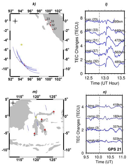 Figure 2k,l is the CID in the 2016 West Sumatra earthquake observed by the GLONASS PRN 4 satellite. The figure shows a negative anomaly, which was caused by the north directivity of the propagation signal [17]. The epicenter was located in the south of the geomagnetic field alongside its SIP. However, the propagation was headed toward north direction, resulting in a smaller CID [16]. This satellite contained a positive anomaly after the negative CID. We indicated the anomaly as an Equatorial Ionization Anomaly (EIA), where this satellite’s SIP at that time was in orbit of the EIA area, confirmed using Global Ionospheric Maps (GIMs). This phenomenon usually occurs at low and equatorial latitudes in the ionosphere, as shown in Figure A3 [26,27].