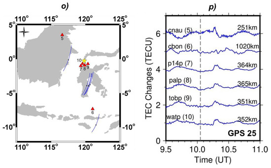 The 7.5 Mw Palu earthquake occurred on 28 September 2018 at 10:02 UT, with the earthquake epicenter centered on the coast of Sulawesi Island, about 50 miles north of the city of Palu. Based on USGS data, parameters of dip, strike, and slip were 67°, 350°, and −17°, respectively. The results of Okada modeling for the earthquake are shown by Figure 5b. The earthquake mechanism was a strike-slip earthquake, while the CID response to this earthquake showed an inverted N wave shape, seen in Figure 2c (inverted N-type wave) [37]. The vertical movement of the ocean floor (and sea surface as well) triggered the CIDs discovered in this study, as presented in Figure 5a for the 2016 West Sumatra earthquake and Figure 5b for the 2018 Palu earthquake. Even a pure strike-slip earthquake can produce vertical crustal movements to some extent [16]. The TEC responses to the 2018 Palu earthquake were where the co-seismic vertical movements were dominated by subsidence. The co-seismic TEC changes observed by GPS PRN 25 showed a compound signal, an inverted N-wave (Figure 2o), that was detected until ∼1400 km. On the other hand, the apparent velocity of the negative disturbance was ∼0.97 km s−1 (Figure 4f). Thus, our observations suggest that ground subsidence induces ionosphere disturbances starting with negative changes.