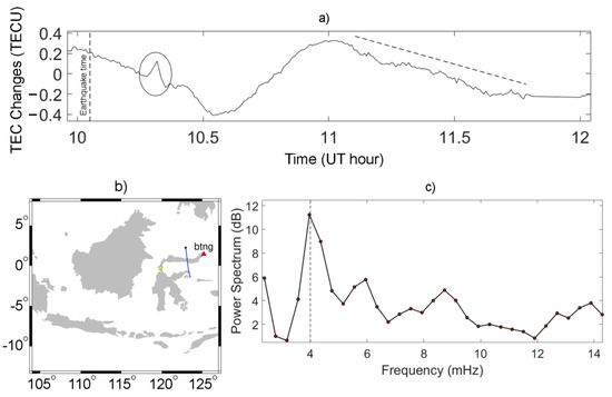 Figure 3 shows the spectrogram obtained by the Blackman–Tukey method using the TEC time-series after the mainshock. The observed peak frequencies were ∼4 mHz. This is consistent with the atmospheric resonance frequencies during certain time windows (~1 h). In order to clarify the dominant frequency, the BTNG station was chosen to calculate power spectral density with the significant oscillations ranging about 55 min (11.1–11.8 UT). This time range produced a frequency at 4 mHz as the dominant frequency. This frequency is one of the atmospheric resonance frequencies that often appear after large earthquakes [6,18,29,30,31,32,33,34]. In this result, one way would be to give the range of power about ±0.5 of the peak power and frequency about ±0.3 mHz. The sampling data was 30 s, while the maximum frequency in the periodogram was 16.67 mHz. This value is in accordance with the results obtained from 2004 Sumatra–Andaman earthquake [18], the 2011 Tohoku-Oki earthquake [30,31], and the 2007 Bengkulu earthquake [21]. Resonance in the atmosphere is caused by acoustic waves generated by movements in the lithosphere (earthquake) that propagate vertically. This wave is reflected downward and interferes with the wave propagating upward; this phenomenon causes resonant oscillations [35,36]. Oscillations were clearly detected after the 2018 Palu earthquake from station BTNG, which was observed by satellite 21 with a distance about 700 km north of the epicenter, respectively.