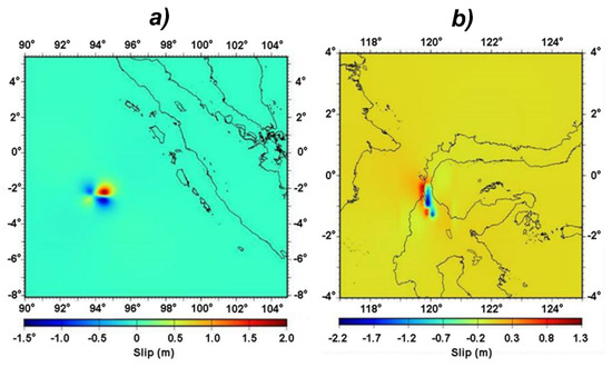 Vertical crustal movements of (a) the 2016 West Sumatra earthquake and (b) the 2018 Palu earthquake. The earthquakes were calculated using [40], using the fault geometry taken from USGS. Although the earthquakes were dominated by the strike-slip mechanism, significant vertical movements occurred.