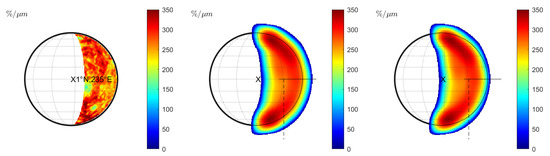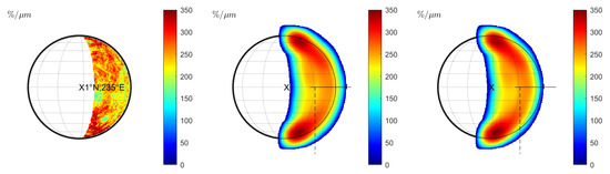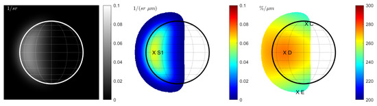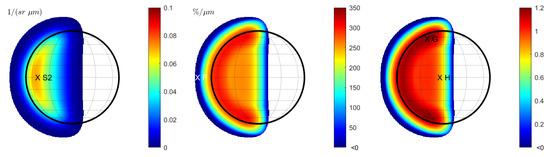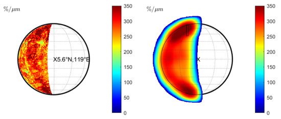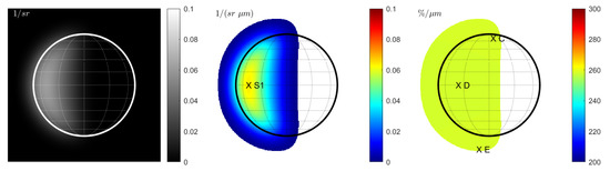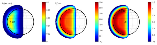Various expressions are available for and D. The KS3 model used by Domingue et al. [17] consists of an exponential term that models the opposition surge and a disk function that combines a Lommel–Seeliger and a Lambert term. The parameter a controls the behavior of the exponential phase function, and determines the relative strength of the Lommel–Seeliger and the Lambert contribution.