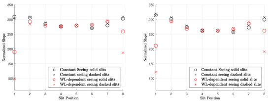 Observation 12 (KS3 model): (Left): Normalized slope without seeing. (Right): Normalized slope for wavelength-dependent seeing approximate slit position according to Warell et al. [9].