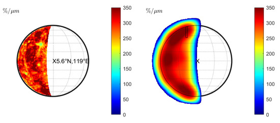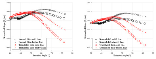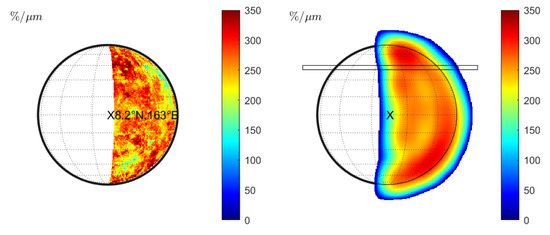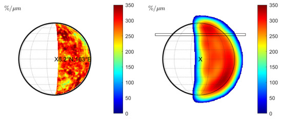 Vernazza et al. [10] also report a strong negative correlation between spectral slope and emission angle. We model the corresponding seeing disk according to observation 19 in Table 1. The illuminated region (Figure 10 (left) and Figure 11 (left)) contains the craters Beethoven, Vivaldi, and Sholem Alaichem. Figure 10 (middle) shows the wavelength-dependent changes of the normalized slope for a FWHM of . A transition region encircles the seeing disk in which the spectral slope decreases. Vernazza et al. [10] do not provide the exact alignment between seeing disk and emission angle. The spectral slope transition region will lie outside the projected disk if the disk is perfectly mapped. In this case, no meaningful correlation between emission angle and spectral slope can be detected in the profiles. We trace the spectral slope and the emission angle at the profiles indicated in Figure 10 (middle) and display the relationship in Figure 12 (left) with black symbols. However, Vernazza et al. [10] state that there is an uncertainty of 10–20 in the emission angle due to uncertainty of the observation slit’s position. We find that the relationship between emission angle and the spectral slope is very sensitive to the exact alignment. Uncertainty of the slit position, misalignment, or disk distortion through atmospheric turbulence may cause the disk’s rim and the spectral slope transition zone to fall together. We simulate the potential impact of these effects by a small translation. Shifting the disk by just 7.5% of the angular diameter, which corresponds to roughly in emission angle at the center of the disk, already leads to a significant inverse correlation between emission angle and normalized spectral slope. The shifted disk is seen in Figure 10 (right) and the relationship between emission angle and slope is plotted in red in Figure 12 (left). This observation holds, considering the center of the visible part toward the limb, but the spectral slope also decreases toward the terminator. However, the emission angle remains around 10–20 such that no relationship between emission angle and spectral slope can be confirmed in this region. We repeated the entire simulation with the KS3 model and displayed the disk in Figure 11 and the slope analysis in Figure 12 (right). The slit-integrated normalized spectral slope behaves similarly to Figure 12 (left), but the slope is slightly lower. The study of Vernazza et al. [10] does not provide an explicit discussion of the spectral slope near the terminator. The work of Warell [6] only presented slit-integrated spectra that do not resolve the region around the terminator. Therefore, it is unclear whether the simulation around the terminator is consistent with the observations. Under the assumption of slit uncertainty, misalignment, or distortion, we can reproduce the alleged correlation between emission angle and spectral slope for the given profiles. Consequently, the true cause for a decreasing normalized spectral slope may be rooted in wavelength-dependent seeing and the sampling position on the seeing disk instead of an effect controlled by the emission angle.