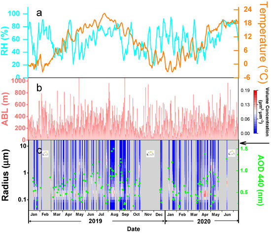 Daily variation in meteorological parameters, including relative humidity (RH) and temperature at 850 hPa (a), atmospheric boundary layer height (ABL) (b), and columnar volume size distribution (VSD) (c). The gray are in (c) denotes days without AOP inversions due to unfavorable observation conditions (e.g., cloudy, rainy). The daily parameters used here are the daily average composites of raw observations. AOD variation is also shown in (c). Note that double y-axes are employed in (a,c).
