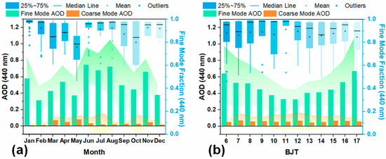Monthly (a) and diurnal (b) variation in columnar fine/coarse AOD, fine-mode fraction (FMF, 440 nm), throughout the whole study period. The translucent bands in green and orange represent the standard deviation ranges for the fine and coarse modes, respectively. The boxplots in blue denote monthly/hourly variation in FMF at 440 nm. “BJT” denotes Beijing standard time (UTC + 08).