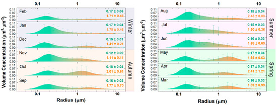 Monthly variation in columnar aerosol volume size distribution over the study period. The average and standard deviation of effective radius of fine- and coarse-mode aerosols are marked in green and orange, respectively, in each panel.