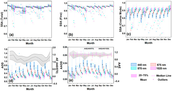 Monthly variation in spectral dependence of SSA of total (a), fine-mode (b), and coarse-mode aerosols (c), AOD (d), and AAOD (e). The AOP at wavelengths of 440, 675, 870, and 1020 nm is shown in blue, red, cyan, and pink, respectively. The horizontal line within each box represents the median, while the black dot within each box represents the mean value.