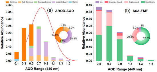 Aerosol classification analysis can be applied to the AOP observations to facilitate characterization of aerosols, as well as the apportionment of potential sources of aerosols [13,40]. Based on the parameters analyzed above, two threshold methods, using AOD-AROT and SSA-FMF parameter pairs, respectively, were employed to classify all of the observations throughout the study period. As mentioned above, observations with AOD (440 nm) of less than 0.4 were screened out for quality assurance. The classification results at different aerosol loadings can be seen in Figure 5. The reason for using both classification methods in the current study instead of a single method was that the two methods classify aerosols into different systems, with the AOD–AROT classifying aerosols into types related to the type of the dominant aerosol particles, while the other method classifies them into types related to the level of absorptivity (i.e., non-/moderately/slightly absorbing), thus more comprehensively characterizing the aerosols in the study region.