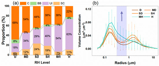 The process of hygroscopic growth could be examined by the variation in VSD with increasing RH, as can be vividly seen in Figure 6b. In order to study the variation more clearly, the number of RH levels here was enlarged to six groups: D (dry; RH < 15%), MD (moderately dry; RH between 15% and 25%), SD (slightly dry; RH between 25% and 35%), SH (slightly humid; RH between 35% and 50%), MH (moderately humid; RH between 50% and 60%), and H (humid; RH greater than 60%). The selection of thresholds above was mainly determined by the distribution of RH, in order to ensure that an adequate number of observations are available in each rank. A vivid volume increase with RH can be observed for some accumulation-mode aerosols with a large radius (between 0.335 and 0.992 μm; purple area in Figure 6b). The radius of water-soluble aerosols increases under high RH conditions, thus increasing the volume concentration. Furthermore, the obvious growth in this specific radius range may be closely related to the high volume fraction of water-soluble aerosols—especially for the urban industry and continental aerosols [61].