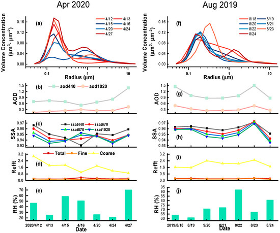 Daily average variation in critical aerosol optical properties of VSD (a,f), AOD (b,g), SSA (c,h), effective radius (d,i), and RH (e,j) during the two episodes. Note that the y-axes of relative humidity (i.e., (e,j)) for the two episodes are different in scale.