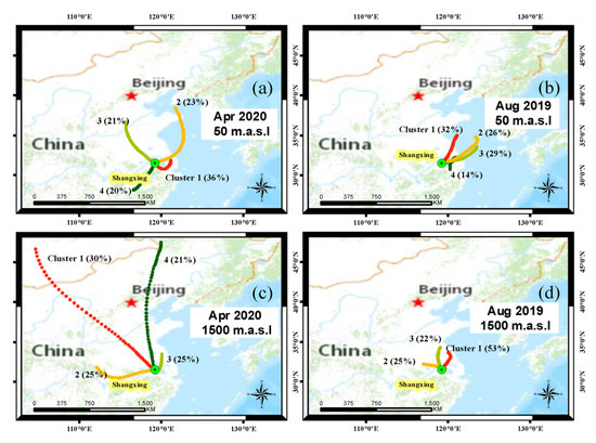The first period was from 12–27 April 2020, which witnessed a heavy pollution episode with a high concentration of fine-mode aerosols. Extremely high loading of fine-mode aerosol concentration, which reached as high as 0.17 (μm3·μm−2), could be observed on four days (12, 13, 24, and 27 April; plotted in orange and brown), as shown in Figure 7a. According to Figure 1c, the large concentration of accumulation-mode aerosols during this period was rare throughout the whole study period. To investigate the possible reason for this abnormal phenomenon, we carried out the daily back-trajectory analysis (runtime: 48 h) using HYSPLIT during the episode at two different levels (50 and 1500 m a.s.l). Cluster analysis was further applied on the daily trajectory results. According to the results of clustering analysis shown in Figure 8a,c, at the 50 m level, the majority of air masses arriving at the site originated from central Shanghai as well as northeastern Zhejiang Province (36%, Cluster 1), which are highly populated and developed in industry. The local emissions were from vehicles and household cooking, and were mainly composed of fine-mode particles. Furthermore, relatively high RH on 27 April (~70%) enhanced the hygroscopic growth of the aerosols. When comparing the results with the trajectory clusters of April 2019 (Figure A1), we can see that the dominant aerosol masses at the 50 m level were from the East China Sea (~66%), and that they may be the main reason for the abnormally high volume of accumulation-mode aerosols in April 2020. Another interesting phenomenon worth noting is the aerosol characteristics on 16 April, where the volume concentration of fine-mode aerosols is obviously lower than that of the coarse-mode aerosols, as can be seen in Figure 7a; in addition, positive correlation between wavelength and SSA can be seen (Figure 7c), and the ratio between AOD 1020 nm and AOD 440 nm is high (~0.5). Seventy-two-hour back-trajectory analysis reveals that this is closely related to the possible regional transportation of desert dust aerosols from Northwest China and Mongolia (Figure A2). As noted in Section 3.2 and [40,63], high AROT for 1020 nm (>0.5) and positive correlation between SSA and wavelength are typical features of dust aerosols.